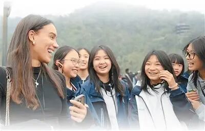 考察团成员梅里顿(左一)在都江堰景区与当地学生交谈。陈春安摄