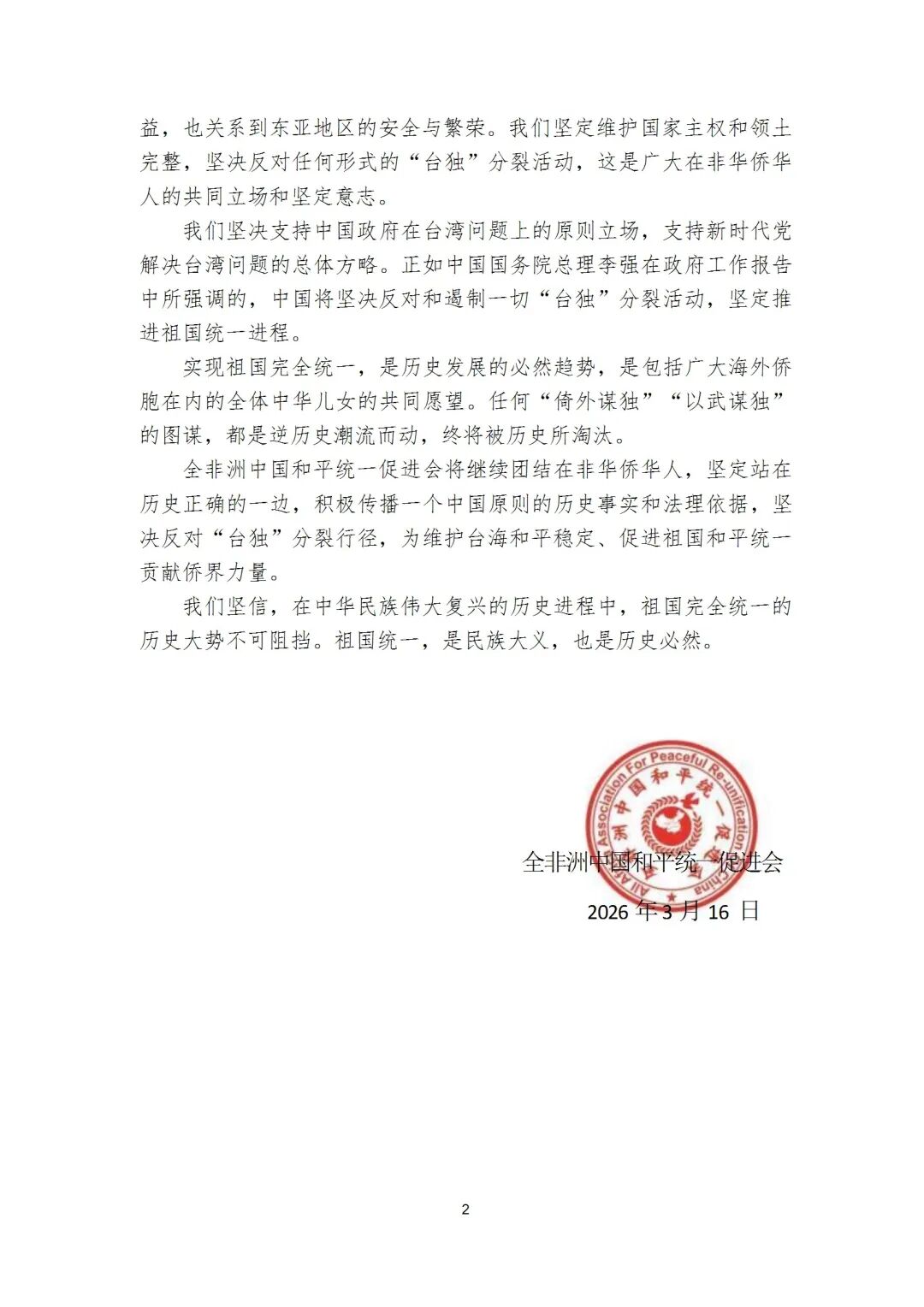 近日,全非洲中国和平统一促进会发表声明,坚决反对、强烈谴责赖清德“台独”分裂言论。声明全文如下: