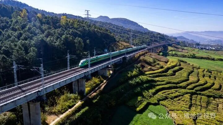 2025年12月2日,一列中老铁路“复兴号”动车组穿过云南省普洱市宁洱哈尼族彝族自治县的麦田(无人机照片)。新华社发(殷学合 摄)