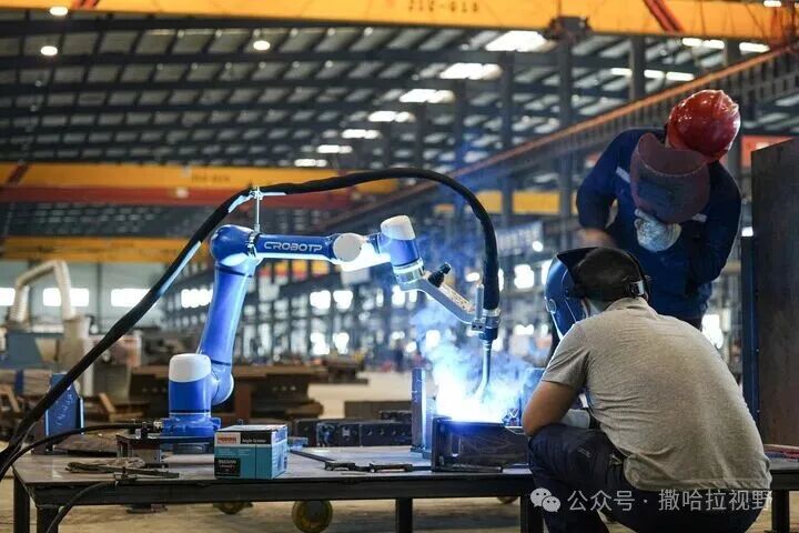 2025年6月26日,在四川天府新区眉山片区青龙街道的新筑智能工程装备制造有限公司车间内,工人配合机器人焊接产品。新华社发(翁光建 摄)