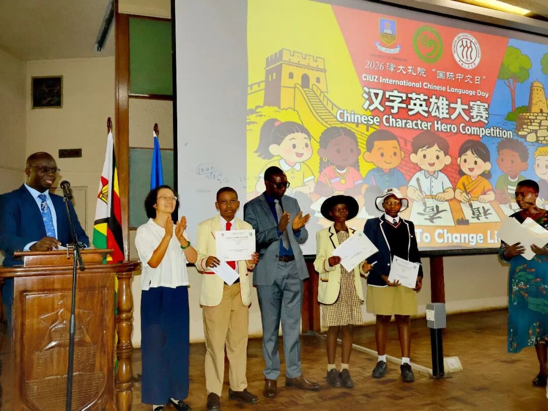 3月27日,驻津巴布韦大使周鼎出席2026年津巴布韦大学孔子学院“国际中文日·汉字英雄大赛”并致辞。津大人文学院院长曼格纳、孔院师生等近300人参加。